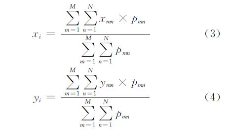 如圖2(b)所示,在經(jīng)過大津法處理后,各個燈點(diǎn)區(qū)域互不連通,又因為單個燈點(diǎn)區(qū)域近似為一圓形,且燈點(diǎn)的排列是有規(guī)則的,因此可把每一個LED燈點(diǎn)區(qū)域中心近似看作為燈點(diǎn)所在位置的中心點(diǎn)。本文采用一階矩質(zhì)心法(也稱作重心法)來確定各個燈點(diǎn)的中心位置,其計算表達(dá)式為