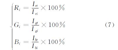 式中Ri、Gi、Bi分別為第i個燈點(diǎn)的紅色、綠色、藍(lán)色的校正系數(shù);Irt、Igt、Ibt為三色校正目標(biāo)值的相對亮度值;Iri、Igi、Ibi為第i個燈點(diǎn)三色相對亮度值。因此每個燈點(diǎn)所對應(yīng)的校正矩陣為[RiGiBi]T。