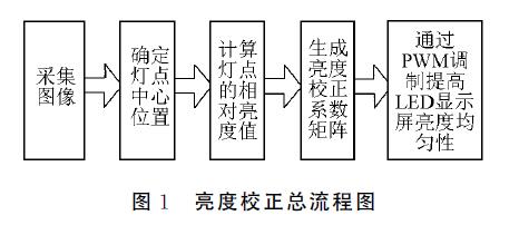 本文運(yùn)用數(shù)字圖像處理技術(shù)對顯示屏上每個燈點(diǎn)的相對亮度進(jìn)行檢測和提取,計算出各個燈點(diǎn)的校正系數(shù)矩陣,并運(yùn)用脈沖寬度調(diào)制(PWM)方法調(diào)節(jié)相應(yīng)燈點(diǎn)的亮度,從而提高全彩LED顯示屏的亮度均勻性。圖1為算法的總流程圖。