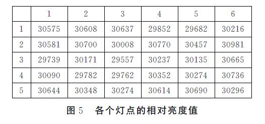 (2)以每個燈點(diǎn)的中心位置為中心,以操作距離為半徑作圓,如圖4所示,提取該圓形區(qū)域內(nèi)的各個像素的灰度值進(jìn)行求和。此灰度值的和即為該燈點(diǎn)的相對亮度值。在全部亮度提取完后保存為亮度數(shù)據(jù)文件,如圖5所示。
