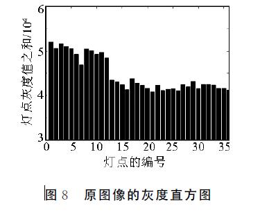 在確定燈點(diǎn)的具體位置之前,先要對采集到的圖像進(jìn)行灰度分布的統(tǒng)計,在所獲取的感光圖像中,由于燈點(diǎn)一般是由矩陣的方式排列,且燈點(diǎn)區(qū)域與背景區(qū)域的灰度值存在明顯的差異,有時還會產(chǎn)生環(huán)繞光的現(xiàn)象,因此需對圖像進(jìn)行二值化處理。本文采用了大津法(OTSU)確定閾值,該方法計算簡便,且在一定條件下不受圖像對比度和亮度變化的影響,所以應(yīng)用非常廣泛。其原理如下: