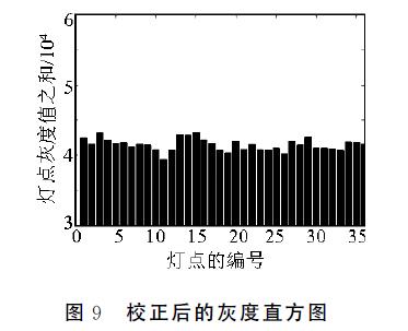 圖8和圖9分別為校正前和校正后各燈點(diǎn)的相對亮度值直方圖。通過比較可以看出,校正前直方圖數(shù)據(jù)的差異性比較大,而校正之后直方圖數(shù)據(jù)的差異相對比較小,在特殊的情況下,如果統(tǒng)計的數(shù)據(jù)不存在任何的差異,直方圖會呈現(xiàn)一條直線。從實(shí)驗數(shù)據(jù)中可以發(fā)現(xiàn),在經(jīng)過亮度校正后,亮度均勻性得到了很好的改善。